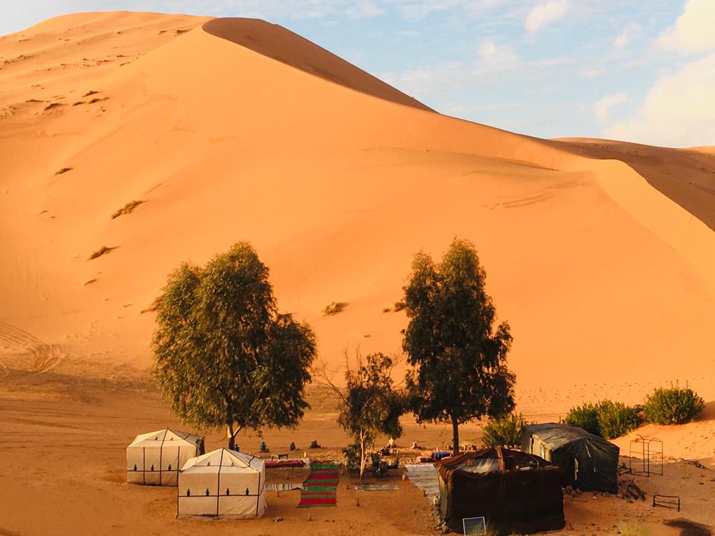 Seguiremos nuestro itinerario entre grandes dunas de arena fina y dorada, moldeadas por la acción del viento. Podemos cruzar campamentos nómadas identificables desde lejos, por sus tiendas marrones hechas con pelo de cabra o de camello. Llegaremos a Erg Elghoul para asentar nuestro campamento.