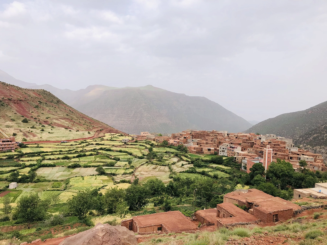 Subida en el Valle de Ourika, cruzando pueblos, a lo largo de cultivos terrazas y canales de riego hacia Iabassenne. Alojamiento en albergue.